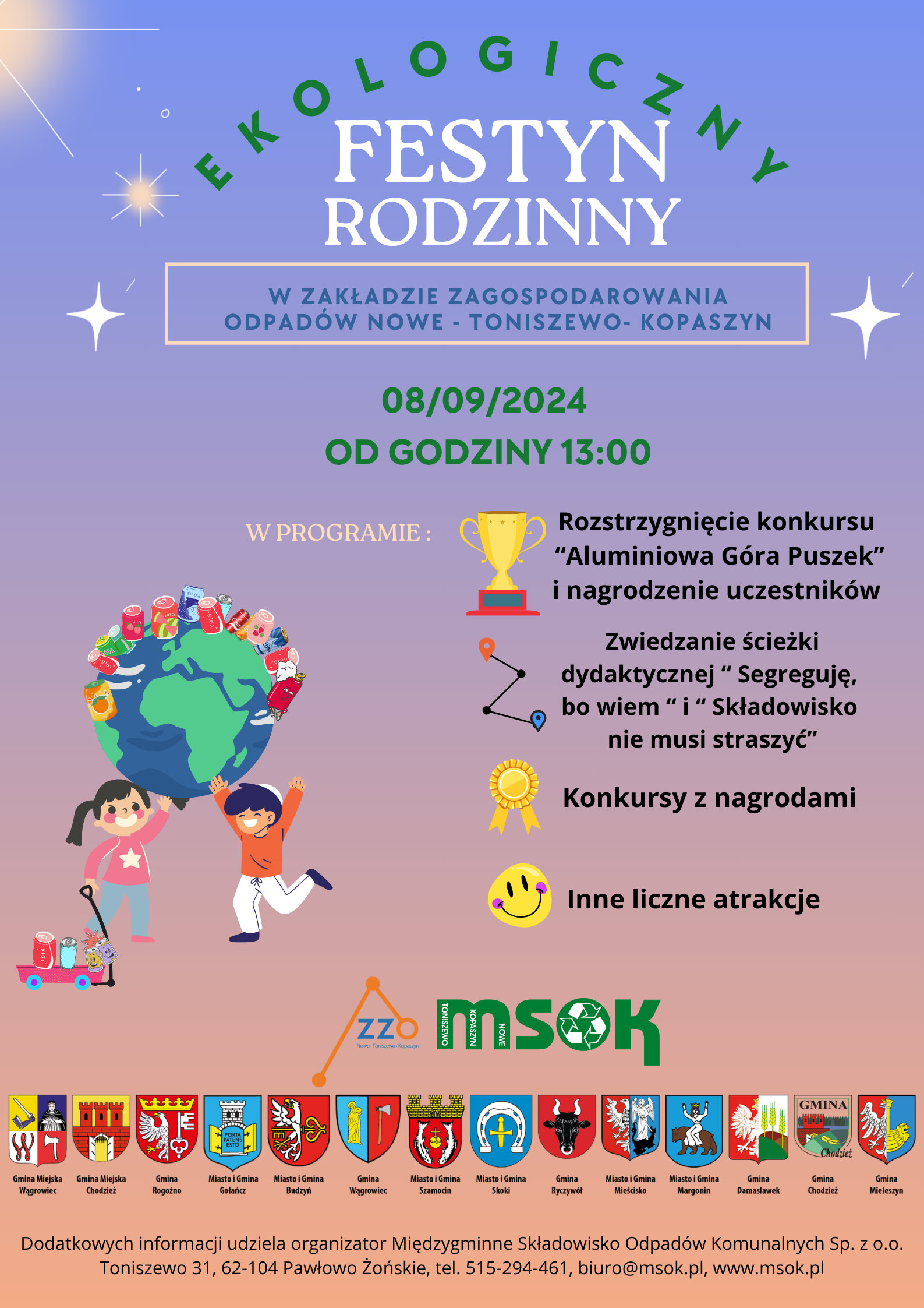 Zarząd Międzygminnego Składowiska Odpadów Komunalnych Sp. z o.o. zaprasza na EKOLOGICZNY FESTYN RODZINNY, podczas którego rozstrzygnięty zostanie konkurs „Aluminiowa Góra Puszek” dnia 08.09.2024 roku (NIEDZIELA ), o godzinie 13:00.