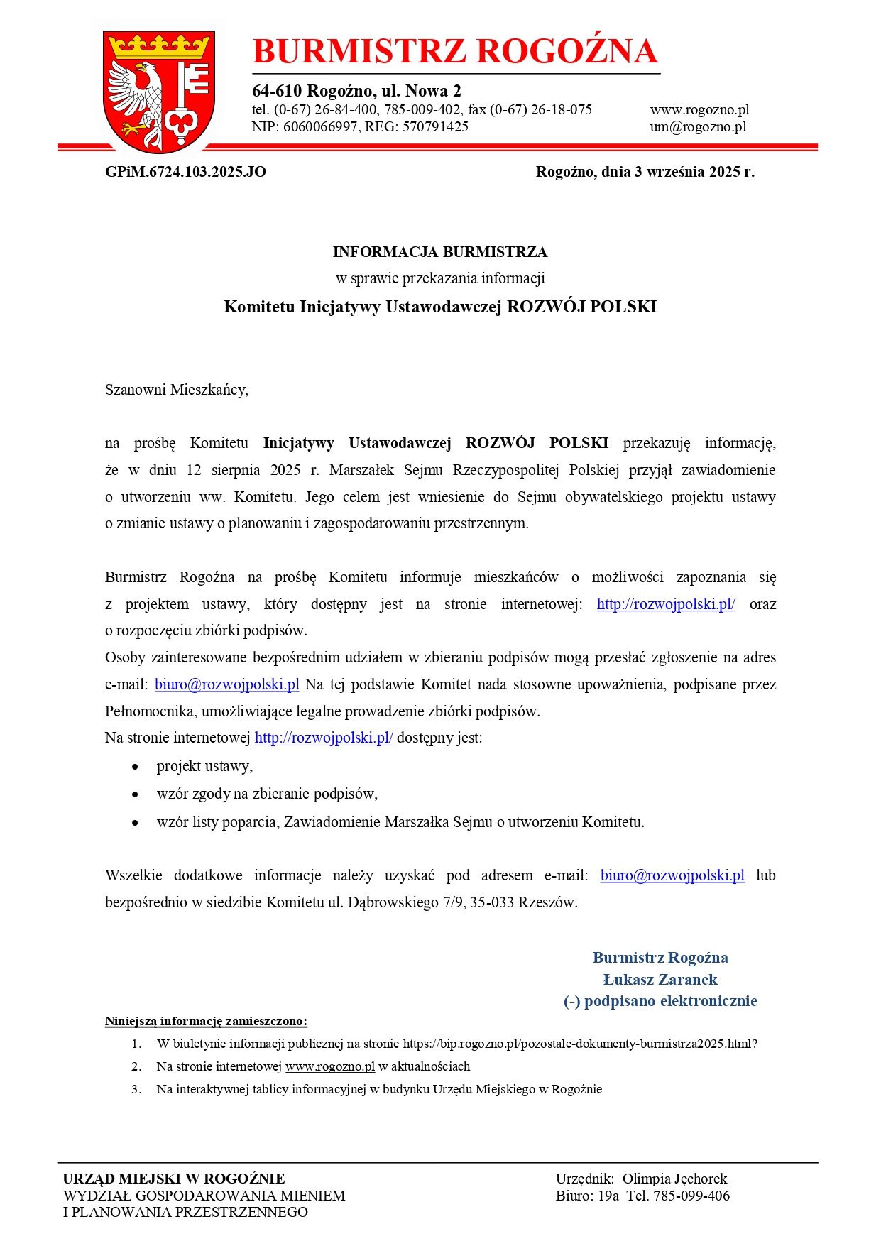Szanowni mieszkańcy, zapraszamy do zapoznania się z informacją Burmistrza Rogoźna dot. utworzenia Komitetu Inicjatywy Ustawodawczej ROZWÓJ POLSKI.