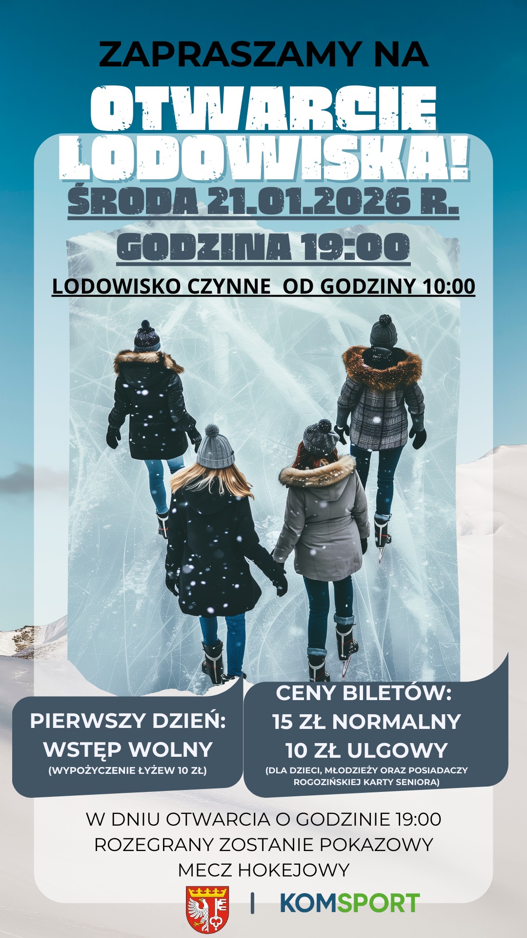 Już w środę, 21 stycznia 2026 r. o godz. 19:00 zapraszamy na uroczyste otwarcie lodowiska!